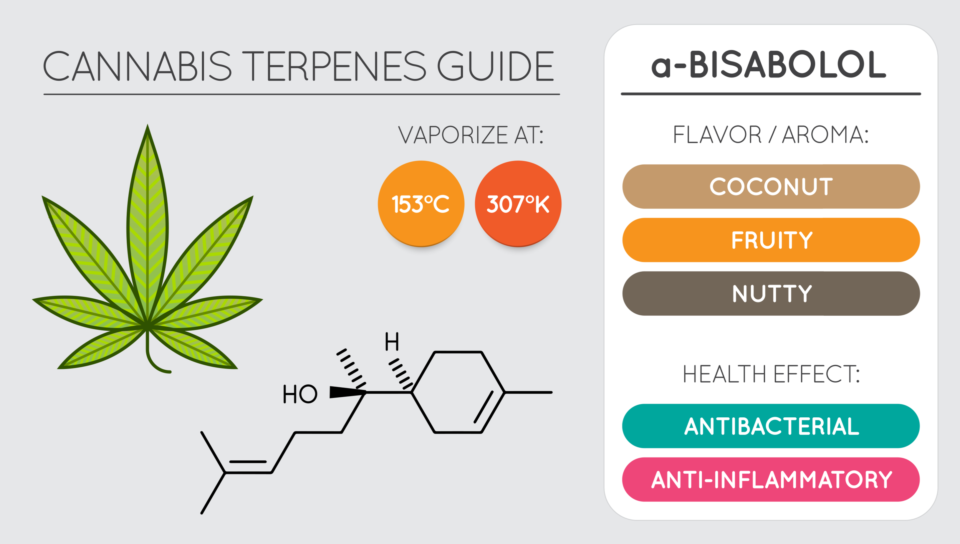 Alpha-bisabolol (aka levomenol and bisabolol) has a pleasant floral aroma and can also be found in chamomile flower and candeia tree. This terpene is used primarily in the cosmetics industry, but lately it has caught the attention of researchers since it has showed medical benefits, especially in cannabis.
